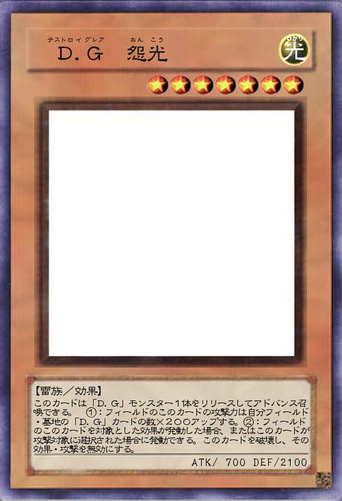 | このカードは「D.G」モンスター1体をリリースしてアドバンス召喚できる。 ①:フィールドのこのカードの攻撃力は自分フィールド・墓地の「D.G」カードの数×200アップする。②:フィールドのこのカードを対象とした効果が発動した場合、またはこのカードが攻撃対象に選択された場合に発動できる。このカードを破壊し、その効果・攻撃を無効にする。 | |||