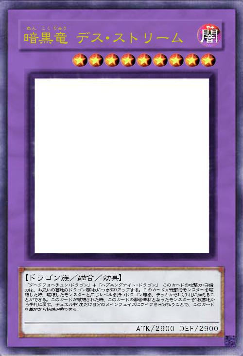 | 「ダークフォーチュン・ドラゴン」+「ハプニングナイト・ドラゴン」 このカードの攻撃力・守備力は、お互いの墓地のドラゴン族1枚につき300アップする。このカードが戦闘でモンスターを破壊した時、破壊したモンスターと同じレベルを持つドラゴン族を、デッキから1枚手札に加えることができる。このカードが破壊された時、このカードの融合素材となったモンスターを1枚墓地から手札に戻す。デュエル中1度だけ自分のメインフェイズにライフを半分払うことで、このカードを墓地から特殊召喚できる。 | |||