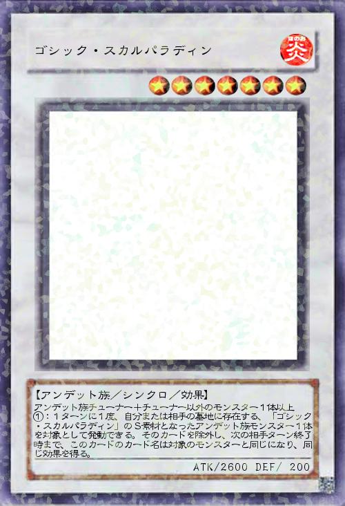 | アンデット族チューナー+チューナー以外のモンスター1体以上 ①:1ターンに1度、自分または相手の墓地に存在する、「ゴシック・スカルパラディン」のS素材となったアンデット族モンスター1体を対象として発動できる。そのカードを除外し、次の相手ターン終了時まで、このカードのカード名は対象のモンスターと同じになり、同じ効果を得る。 | |||