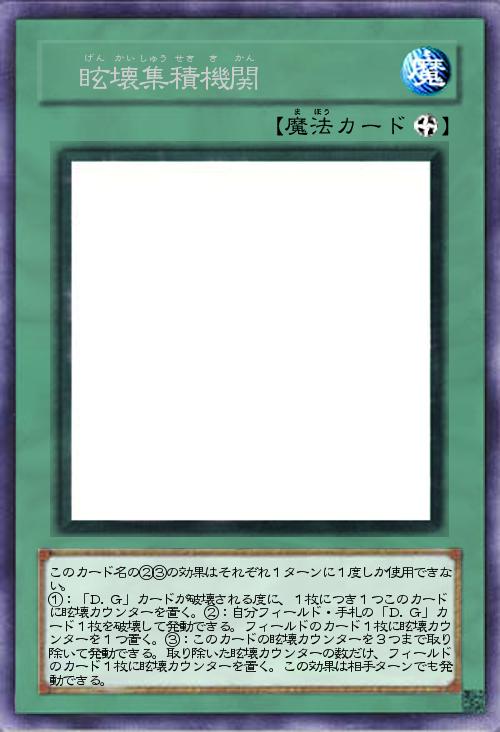 | このカード名の②③の効果はそれぞれ1ターンに1度しか使用できない。 ①:「D.G」カードが破壊される度に、1枚につき1つこのカードに眩壊カウンターを置く。②:自分フィールド・手札の「D.G」カード1枚を破壊して発動できる。フィールドのカード1枚に眩壊カウンターを1つ置く。③:このカードの眩壊カウンターを3つまで取り除いて発動できる。取り除いた眩壊カウンターの数だけ、フィールドのカード1枚に眩壊カウンターを置く。この効果は相手ターンでも発動できる。 | |||