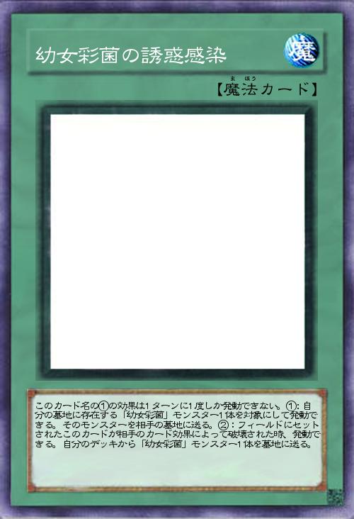 | このカード名の①の効果は1ターンに1度しか発動できない。①:自分の墓地に存在する「幼女彩菌」モンスター1体を対象にして発動できる。そのモンスターを相手の墓地に送る。②:フィールドにセットされたこのカードが相手のカード効果によって破壊された時、発動できる。自分のデッキから「幼女彩菌」モンスター1体を墓地に送る。 | |||