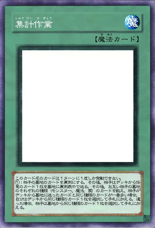 | このカード名のカードは1ターンに1度しか発動できない。 ①:相手の墓地のカードを裏側にする。その後、相手はデッキから任意のカード1枚を墓地に裏側表示で送る。その後、お互い相手の墓地のそれぞれの種類(モンスター、魔法、罠)のカードを数え、相手がデッキから墓地に送ったカードと同じ種類のカードが一番多い場合、自分はデッキから同じ種類のカード1枚を選択して手札に加える。違った場合、相手は墓地から同じ種類のカード1枚を選択して手札に加える。 | |||