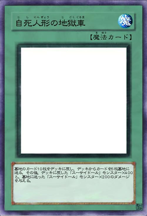 | 墓地のカード10枚をデッキに戻し、デッキからカードを5枚墓地に送る。その後、デッキに戻した「スーサイドール」モンスター×400と、墓地に送った「スーサイドール」モンスター×200のダメージを与える。 | |||