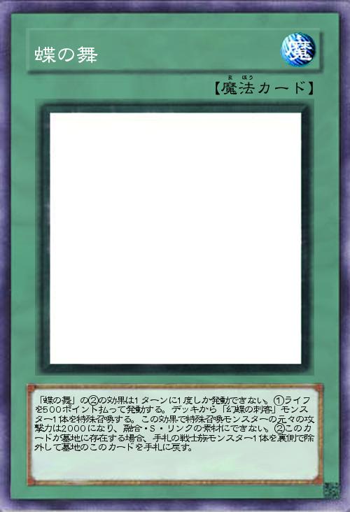 | 「蝶の舞」の②の効果は1ターンに1度しか発動できない。①ライフを500ポイント払って発動する。デッキから「幻蝶の刺客」モンスター1体を特殊召喚する。この効果で特殊召喚モンスターの元々の攻撃力は2000になり、融合・S・リンクの素材にできない。②このカードが墓地に存在する場合、手札の戦士族モンスター1体を裏側で除外して墓地のこのカードを手札に戻す。 | |||