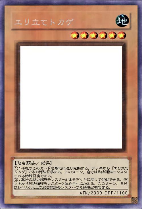 | ①:手札のこのカードを墓地に送り発動する。デッキから「エリ立てトカゲ」2体を特殊召喚する。このターン、自分は爬虫類族モンスターのみ特殊召喚できる。 ②:墓地の爬虫類族モンスター4体をデッキに戻して発動できる。デッキから爬虫類族モンスター2体を手札に加える。このターン、自分はレベル5以上の爬虫類族モンスターのみ特殊召喚できる。 | |||
