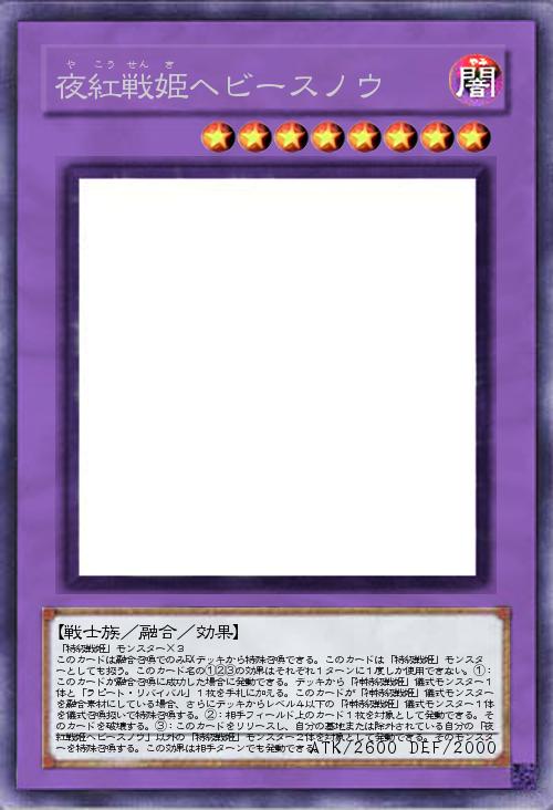 | 「特級戦姫」モンスター×3 このカードは融合召喚でのみEXデッキから特殊召喚できる。このカードは「特級戦姫」モンスターとしても扱う。このカード名の①②③の効果はそれぞれ1ターンに1度しか使用できない。①:このカードが融合召喚に成功した場合に発動できる。デッキから「神特級戦姫」儀式モンスター1体と「ラピート・リバイバル」1枚を手札に加える。このカードが「神特級戦姫」儀式モンスターを融合素材にしている場合、さらにデッキからレベル4以下の「神特級戦姫」儀式モンスター1体を儀式召喚扱いで特殊召喚する。②:相手フィールド上のカード1枚を対象として発動できる。そのカードを破壊する。③:このカードをリリースし、自分の墓地または除外されている自分の「夜紅戦姫ヘビースノウ」以外の「特級戦姫」モンスター2体を対象として発動できる。そのモンスターを特殊召喚する。この効果は相手ターンでも発動できる。 | |||