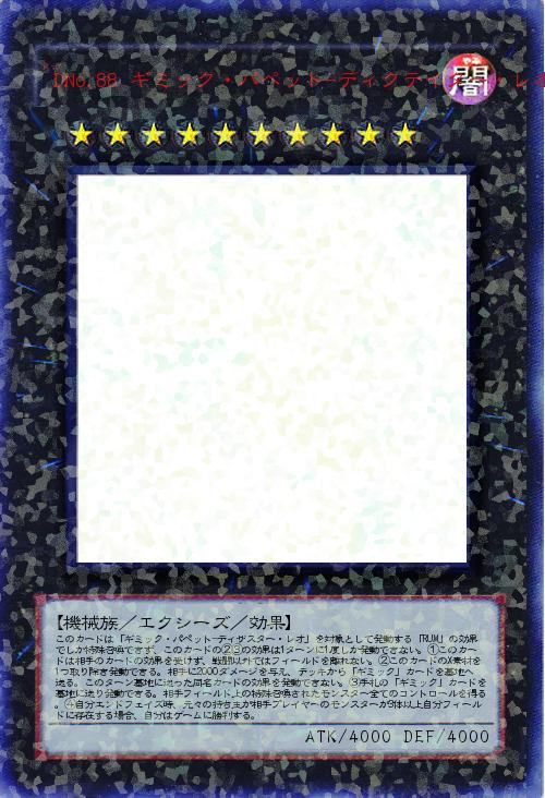 | このカードは「ギミック・パペット-ディザスター・レオ」を対象として発動する「RUM」の効果でしか特殊召喚できず、このカードの②③の効果は1ターンに1度しか発動できない。①このカードは相手のカードの効果を受けず、戦闘以外ではフィールドを離れない。②このカードのX素材を1つ取り除き発動できる。相手に2000ダメージを与え、デッキから「ギミック」カードを墓地へ送る。このターン墓地に送った同名カードの効果を発動できない。③手札の「ギミック」カードを墓地に送り発動できる。相手フィールド上の特殊召喚されたモンスター全てのコントロールを得る。④自分エンドフェイズ時、元々の持ち主が相手プレイヤーのモンスターが3体以上自分フィールドに存在する場合、自分はゲームに勝利する。 | |||