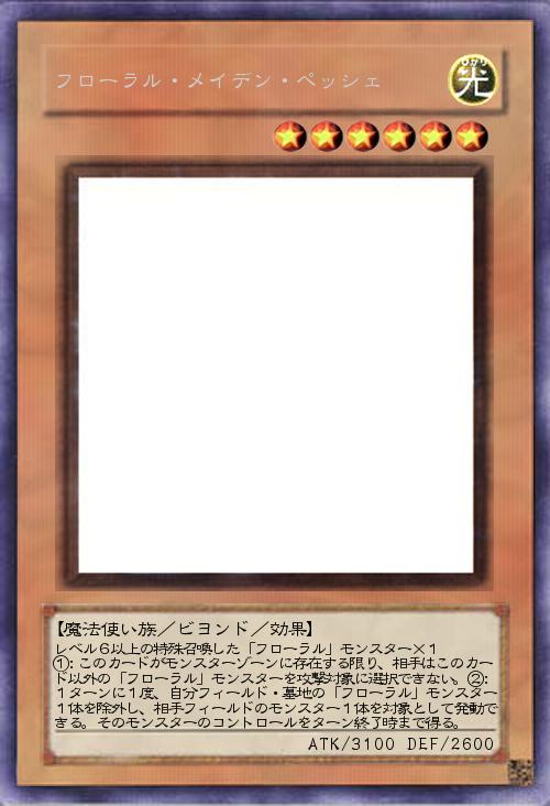 | レベル6以上の特殊召喚した「フローラル」モンスター×1 ①:このカードがモンスターゾーンに存在する限り、相手はこのカード以外の「フローラル」モンスターを攻撃対象に選択できない。②:1ターンに1度、自分フィールド・墓地の「フローラル」モンスター1体を除外し、相手フィールドのモンスター1体を対象として発動できる。そのモンスターのコントロールをターン終了時まで得る。 | |||