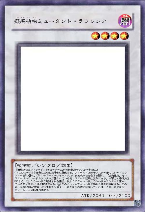 | 「擬態植物コア・シード」+チューナー以外の植物族モンスター1体以上 ①:このカードがS召喚に成功した場合に発動する。フィールド上のモンスター全てにシードカウンターを1つ置く。②:このカードがフィールド上に表側表示で存在する限り、「擬態植物」モンスター以外のシードカウンターが置かれているモンスターの効果は無効になり、攻撃力・守備力は0になる。③:このカードが破壊される場合、代わりにフィールド上のシードカウンターが置かれているモンスター1体を破壊できる。④:このカードがフィールドを離れた場合に発動する。このカードのS召喚に使用したS素材モンスター一組が自分の墓地に揃っていれば、その一組を自分 フィールド上に特殊召喚する。 | |||