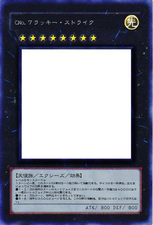 | レベル8モンスター×4 1ターンに一度、このカードのX素材を一つ取り除いて発動できる。サイコロを一回振る。出た目によって以下の効果を適用する。 ●1・2:次の相手のターンのエンドフェイズまでこのカードの攻撃力・守備力は4000になり、一度のバトルフェイズ中に二回攻撃できる。 ●3・4:次のターン、相手はカードをセットできない。 ●5・6:相手に3000ダメージを与える。この効果の発動後、自分はバトルフェイズを行えない。 | |||