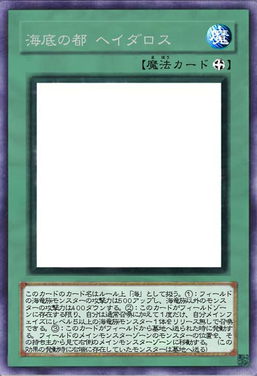 | このカードのカード名はルール上「海」として扱う。①:フィールドの海竜族モンスターの攻撃力は500アップし、海竜族以外のモンスターの攻撃力は400ダウンする。②:このカードがフィールドゾーンに存在する限り、自分は通常召喚に加えて1度だけ、自分メインフェイズにレベル5以上の海竜族モンスター1体をリリース無しで召喚できる。③:このカードがフィールドから墓地へ送られた時に発動する。フィールドのメインモンスターゾーンのモンスターの位置を、その持ち主から見て右側のメインモンスターゾーンに移動する。(この効果の発動時に右端に存在していたモンスターは墓地へ送る) | |||