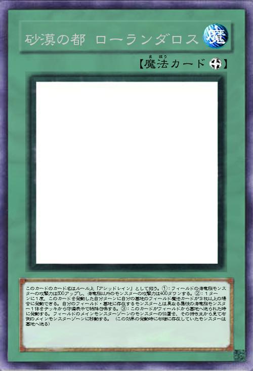 | このカードのカード名はルール上「アシッドレイン」として扱う。①:フィールドの海竜族モンスターの攻撃力は500アップし、海竜族以外のモンスターの攻撃力は400ダウンする。②:1ターンに1度、このカードを発動した自分ターンに自分の墓地のフィールド魔法カードが3枚以上の場合に発動できる。自分のフィールド・墓地に存在するモンスターとは異なる属性の海竜族モンスター1体をデッキから守備表示で特殊召喚する。③:このカードがフィールドから墓地へ送られた時に発動する。フィールドのメインモンスターゾーンのモンスターの位置を、その持ち主から見て右側のメインモンスターゾーンに移動する。(この効果の発動時に右端に存在していたモンスターは墓地へ送る) | |||