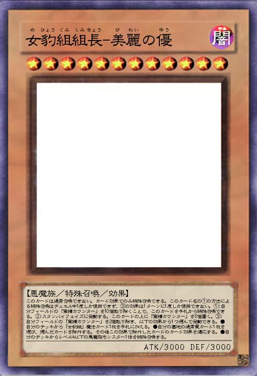 | このカードは通常召喚できない。カード効果でのみ特殊召喚できる。このカード名の①の方法による特殊召喚はデュエル中1度しか使用できず、③の効果は1ターンに1度しか使用できない。①:自分フィールドの「業績カウンター」を10個取り除くことで、このカードを手札から特殊召喚できる。②:スタンバイフェイズに発動する。このカードの上に「業績カウンター」を5個置く。③:自分フィールドの「業績カウンター」を2個取り除き、以下の効果から1つ選んで発動できる。●自分のデッキから「女豹組」魔法カード1枚を手札に加える。●自分の墓地の通常罠カード1枚を選び、選んだカードを除外する。その後この効果で除外したカードのカード効果を適応する。●自分のデッキからレベル4以下の悪魔族モンスター1体を特殊召喚する。 | |||