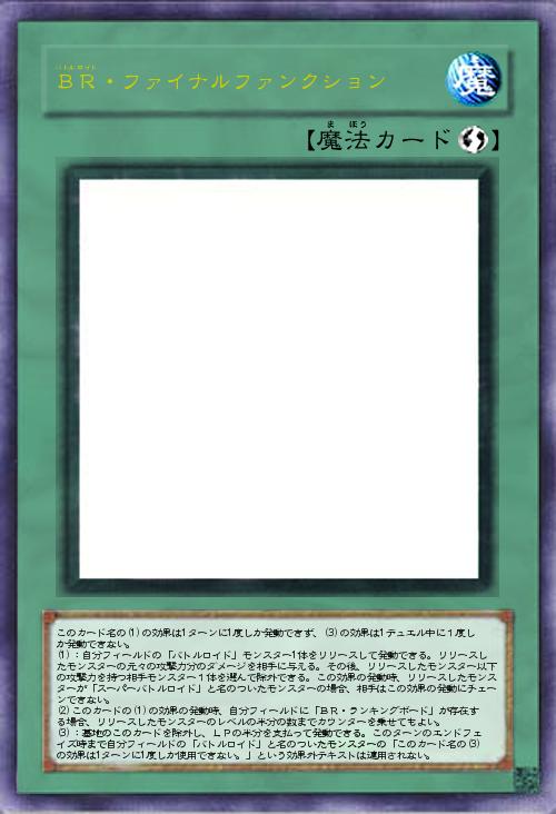 | このカード名の(1)の効果は1ターンに1度しか発動できず、(3)の効果は1デュエル中に1度しか発動できない。 (1):自分フィールドの「バトルロイド」モンスター1体をリリースして発動できる。リリースしたモンスターの元々の攻撃力分のダメージを相手に与える。その後、リリースしたモンスター以下の攻撃力を持つ相手モンスター1体を選んで除外できる。この効果の発動時、リリースしたモンスターが「スーパーバトルロイド」と名のついたモンスターの場合、相手はこの効果の発動にチェーンできない。 (2)このカードの(1)の効果の発動時、自分フィールドに「BR・ランキングボード」が存在する場合、リリースしたモンスターのレベルの半分の数までカウンターを乗せてもよい。 (3):墓地のこのカードを除外し、LPの半分を支払って発動できる。このターンのエンドフェイズ時まで自分フィールドの「バトルロイド」と名のついたモンスター | |||