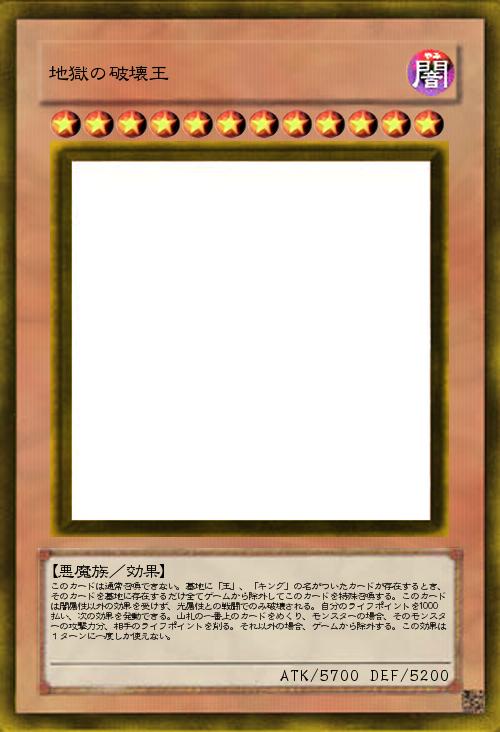 | このカードは通常召喚できない。墓地に「王」、「キング」の名がついたカードが存在するとき、そのカードを墓地に存在するだけ全てゲームから除外してこのカードを特殊召喚する。このカードは闇属性以外の効果を受けず、光属性との戦闘でのみ破壊される。自分のライフポイントを1000払い、次の効果を発動できる。山札の一番上のカードをめくり、モンスターの場合、そのモンスターの攻撃力分、相手のライフポイントを削る。それ以外の場合、ゲームから除外する。この効果は1ターンに一度しか使えない。 | |||