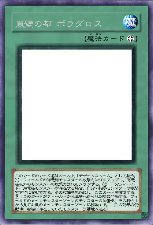 | このカードのカード名はルール上「デザートストーム」として扱う。①:フィールドの海竜族モンスターの攻撃力は500アップし、海竜族以外のモンスターの攻撃力は400ダウンする。②:自分フィールドに海竜族モンスターが存在する場合、自分・相手モンスターの攻撃宣言時に発動できる。その攻撃を無効にし、このカードを破壊する。③:このカードがフィールドから墓地へ送られた時に発動する。フィールドのメインモンスターゾーンのモンスターの位置を、その持ち主から見て右側のメインモンスターゾーンに移動する。(この効果の発動時に右端に存在していたモンスターは墓地へ送る) | |||