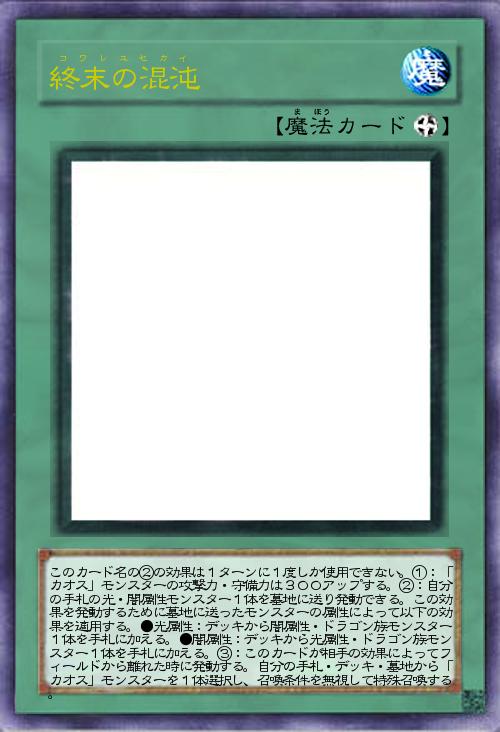 | このカード名の②の効果は1ターンに1度しか使用できない。①:「カオス」モンスターの攻撃力・守備力は300アップする。②:自分の手札の光・闇属性モンスター1体を墓地に送り発動できる。この効果を発動するために墓地に送ったモンスターの属性によって以下の効果を適用する。●光属性:デッキから闇属性・ドラゴン族モンスター1体を手札に加える。●闇属性:デッキから光属性・ドラゴン族モンスター1体を手札に加える。③:このカードが相手の効果によってフィールドから離れた時に発動する。自分の手札・デッキ・墓地から「カオス」モンスターを1体選択し、召喚条件を無視して特殊召喚する。 | |||
