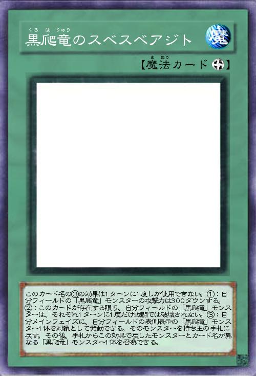 | このカード名の③の効果は1ターンに1度しか使用できない。①:自分フィールドの「黒爬竜」モンスターの攻撃力は300ダウンする。②:このカードが存在する限り、自分フィールドの「黒爬竜」モンスターは、それぞれ1ターンに1度だけ戦闘では破壊されない。③:自分メインフェイズに、自分フィールドの表側表示の「黒爬竜」モンスター1体を対象として発動できる。そのモンスターを持ち主の手札に戻す。その後、手札からこの効果で戻したモンスターとカード名が異なる「黒爬竜」モンスター1体を召喚できる。 | |||
