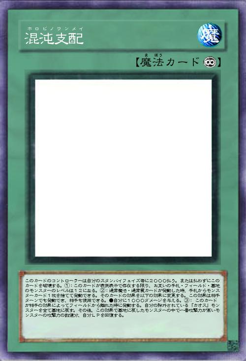 | このカードのコントローラーは自分のスタンバイフェイズ毎に2000払う。または払わずにこのカードを破壊する。①:このカードが表側表示で存在する限り、お互いの手札・フィールド・墓地のモンスターのレベルは12になる。②:通常魔法・通常罠カードが発動した時、手札からモンスターカード1枚を捨てて発動できる。そのカードの効果を以下の効果に変更する。この効果は相手ターンでも発動でき、相手も使用できる。●自分に1000ダメージを与える。③: このカードが相手の効果によってフィールドから離れた時に発動する。自分の除外されている「カオス」モンスターを全て墓地に戻す。その後、この効果で墓地に戻したモンスターの中で一番攻撃力が高いモンスターの攻撃力の数値分、自分LPを回復する。 | |||