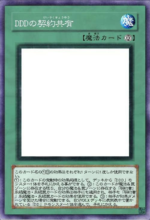 | このカード名の①③の効果はそれぞれ1ターンに1度しか使用できない。 ①:このカードの発動時の効果処理として、デッキから「DDD」モンスター1体を手札に加える事ができる。②:このカードが魔法&罠ゾーンに存在する限り、自分の魔法&罠ゾーンに存在する「契約書」永続魔法・永続罠カードの効果は相手にも適用され、相手も「契約書」永続魔法・永続罠カードの効果を使用できる。③:相手が効果ダメージを受けた場合に発動できる。自分のEXデッキに表側表示で置かれている「DD」Pモンスター1体を選んで、手札に加える。 | |||