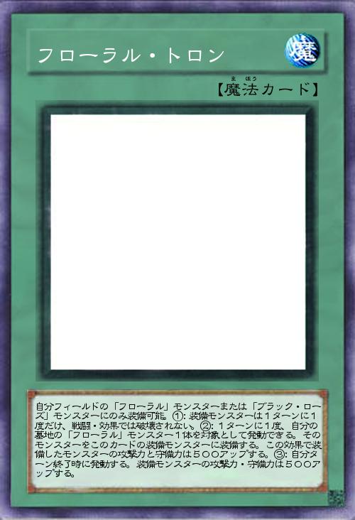 | 自分フィールドの「フローラル」モンスターまたは「ブラック・ローズ」モンスターにのみ装備可能。①:装備モンスターは1ターンに1度だけ、戦闘・効果では破壊されない。②:1ターンに1度、自分の墓地の「フローラル」モンスター1体を対象として発動できる。そのモンスターをこのカードの装備モンスターに装備する。この効果で装備したモンスターの攻撃力と守備力は500アップする。③:自分ターン終了時に発動する。装備モンスターの攻撃力・守備力は500アップする。 | |||