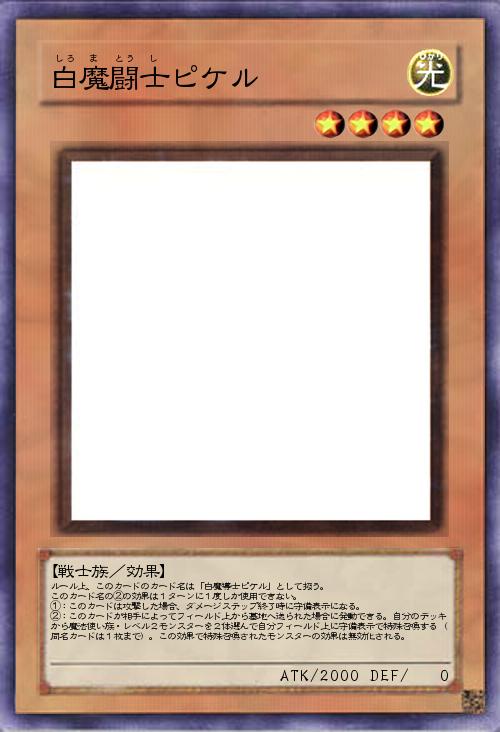 | ルール上、このカードのカード名は「白魔導士ピケル」として扱う。 このカード名の②の効果は1ターンに1度しか使用できない。 ①:このカードは攻撃した場合、ダメージステップ終了時に守備表示になる。 ②:このカードが相手によってフィールド上から墓地へ送られた場合に発動できる。自分のデッキから魔法使い族・レベル2モンスターを2体選んで自分フィールド上に守備表示で特殊召喚する(同名カードは1枚まで)。この効果で特殊召喚されたモンスターの効果は無効化される。 | |||