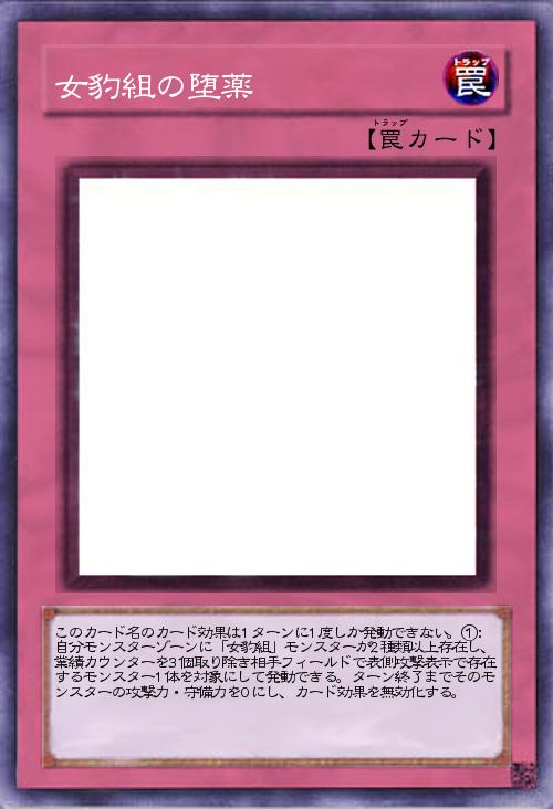 | このカード名のカード効果は1ターンに1度しか発動できない。①:自分モンスターゾーンに「女豹組」モンスターが2種類以上存在し、業績カウンターを3個取り除き相手フィールドで表側攻撃表示で存在するモンスター1体を対象にして発動できる。ターン終了までそのモンスターの攻撃力・守備力を0にし、カード効果を無効化する。 | |||
