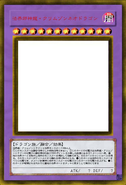 | 法界龍・クリムゾンドラゴン+法界モンスター×4体以上 ①このモンスターは融合召喚でしか特殊召喚できない。②このカードの攻撃力は法界龍・クリムゾンドラゴンの攻撃力に融合素材の数×1500ポイントを加算した数値にになる③1ターンに一度、墓地の法界カードを除外し相手のカードを選択して発動できる。そのカードのコントロールを得る。そのモンスターがフィールドから離れる時に除外される。●このカードは相手のモンスターすべてに攻撃でき、ダメージ計算時に相手モンスターの攻撃力分このカードの攻撃力を上げる。●このカードが破壊される代わりに墓地の法界カードを戻すことで無効にできる | |||