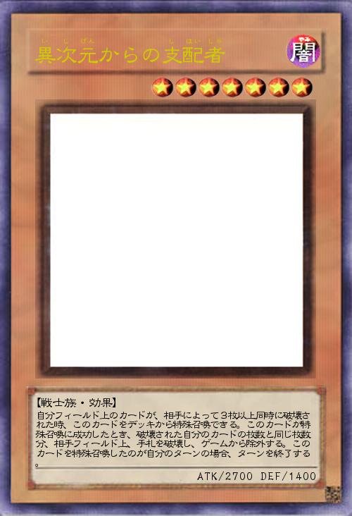 | 自分フィールド上のカードが、相手によって3枚以上同時に破壊された時、このカードをデッキから特殊召喚できる。このカードが特殊召喚に成功したとき、破壊された自分のカードの枚数と同じ枚数分、相手フィールド上、手札を破壊し、ゲームから除外する。このカードを特殊召喚したのが自分のターンの場合、ターンを終了する。 | |||