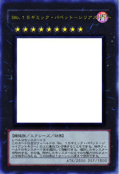 | レベル9モンスター×3 このカードは自分フィールドの「No.15ギミック・パペット-ジャイアントキラー」の上に重ねてX召喚することもできる。相手フィールドのモンスター1体を選択して発動できる。選択したモンスターを除外する。その後、除外したモンスターの元々の攻撃力分のダメージを相手に与える。この効果は1ターンに二度まで使用できる。 | |||