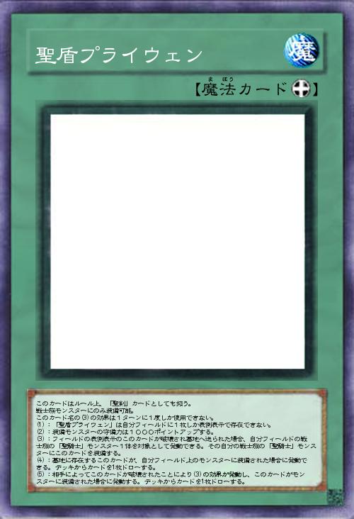 | このカードはルール上、「聖剣」カードとしても扱う。 戦士族モンスターにのみ装備可能。 このカード名の(3)の効果は1ターンに1度しか使用できない。 (1):「聖盾プライウェン」は自分フィールドに1枚しか表側表示で存在できない。 (2):装備モンスターの守備力は1000ポイントアップする。 (3):フィールドの表側表示のこのカードが破壊され墓地へ送られた場合、自分フィールドの戦士族の「聖騎士」モンスター1体を対象として発動できる。その自分の戦士族の「聖騎士」モンスターにこのカードを装備する。 (4):墓地に存在するこのカードが、自分フィールド上のモンスターに装備された場合に発動できる。デッキからカードを1枚ドローする。 (5):相手によってこのカードが破壊されたことにより(3)の効果が発動し、このカードがモンスターに装備された場合に発動する。デッキからカードを1枚ドローする。 | |||