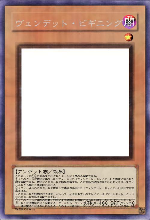 | このカードの①②の効果はそれぞれ1ターンに1度のみ発動できる。 ①:このカードが墓地に存在し自分フィールドの「ヴェンデット・スレイヤー」が墓地に送られた場合発動できる。墓地にこのカードを特殊召喚する。この効果で特殊召喚されたモンスターはフィールドから離れた場合除外される。 ②:フィールドのこのカードを使用して儀式召喚された「ヴェンデット・スレイヤー」は以下の効果を得る。 ・このカードが戦闘を行う場合、バトルフェイズ中お互いのプレイヤーは「ヴェンデット」カード以外のカード効果を発動できない。 ③:このカードが相手の戦闘・効果により破壊され墓地に送られた場合、手札の「ヴェンデット」カード1枚を墓地に送り発動する。デッキから「ヴェンデット・スレイヤー」1枚と「ヴェンデット」儀式魔法1枚を手札に加える。このターン自分は「ヴェンデット」モンスター以外を召喚・特殊召喚できない。 | |||