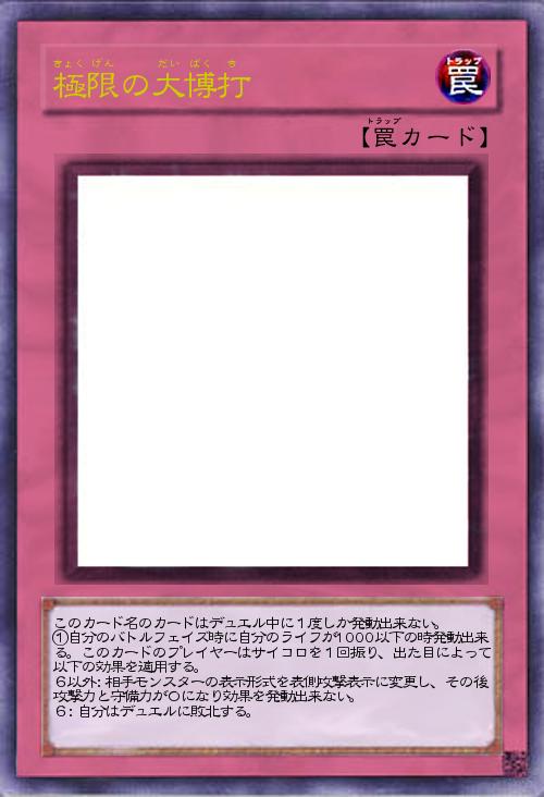| このカード名のカードはデュエル中に1度しか発動出来ない。 ①自分のバトルフェイズ時に自分のライフが1000以下の時発動出来る。このカードのプレイヤーはサイコロを1回振り、出た目によって以下の効果を適用する。 6以外:相手モンスターの表示形式を表側攻撃表示に変更し、その後攻撃力と守備力が0になり効果を発動出来ない。 6:自分はデュエルに敗北する。 | |||