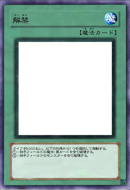 | ライフを5000払い、以下の効果から1つを選択して発動する。 ①:相手フィールドの魔法・罠カードを全て破壊する。 ②:相手フィールドのモンスターを全て破壊する。 | |||