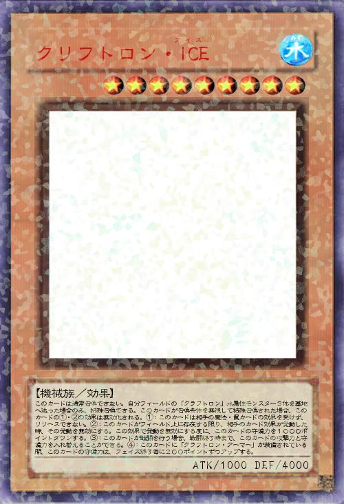 | このカードは通常召喚できない。自分フィールドの「クラフトロン」水属性モンスター3体を墓地へ送った場合のみ、特殊召喚できる。このカードが召喚条件を無視して特殊召喚された場合、このカードの①・②の効果は無効化される。①:このカードは相手の魔法・罠カードの効果を受けず、リリースできない。②:このカードがフィールド上に存在する限り、相手のカード効果が発動した時、その発動を無効にする。この効果で発動を無効にする度に、このカードの守備力を1000ポイントダウンする。③:このカードが戦闘を行う場合、戦闘終了時まで、このカードの攻撃力と守備力を入れ替えることができる。④:このカードに「クラフトロン・アーマー」が装備されている間、このカードの守備力は、フェイズ終了毎に200ポイントずつアップする。 | |||