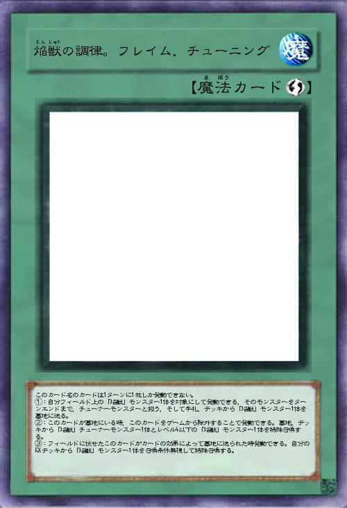 | このカード名のカードは1ターンに1枚しか発動できない。 ①:自分フィールド上の「焔獣」モンスター1体を対象にして発動できる,そのモンスターをターンエンドまで,チューナーモンスターと扱う,そして手札、デッキから「焔獣」モンスター1体を墓地に送る。 ②:このカードが墓地にいる時,このカードをゲームから除外することで発動できる。墓地、デッキから「焔獣」チューナーモンスター1体とレベル4以下の「焔獣」モンスター1体を特殊召喚する。 ③:フィールドに伏せたこのカードがカードの効果によって墓地に送られた時発動できる。自分のEXデッキから「焔獣」モンスター1体を召喚条件無視して特殊召喚する。 | |||