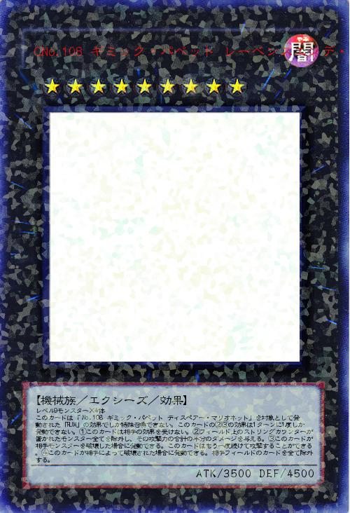 | レベル9モンスター×4体 このカードは「 No.108 ギミック・パペット–ディスペアー・ストリングス」を対象として発動された「RUM」の効果でしか特殊召喚できない。このカードの②③の効果は1ターンに1度しか発動できない。①このカードは相手の効果を受けない。②フィールド上のストリングカウンターが置かれたモンスター全てを除外し、その攻撃力の合計の半分のダメージを与える。③このカードが相手モンスターを破壊した場合に発動できる。このカードはもう一度続けて攻撃することができる。④このカードが相手によって破壊された場合に発動できる。相手フィールドのカードを全て除外する。 | |||