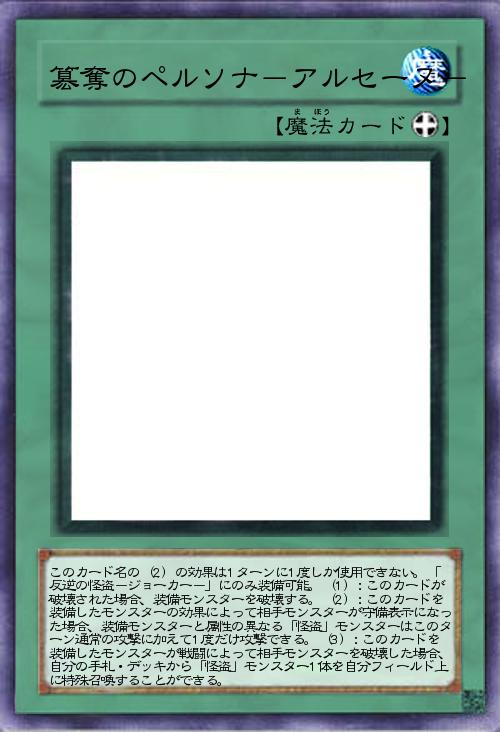 | このカード名の(2)の効果は1ターンに1度しか使用できない。「反逆の怪盗-ジョーカー-」にのみ装備可能。(1):このカードが破壊された場合、装備モンスターを破壊する。(2):このカードを装備したモンスターの効果によって相手モンスターが守備表示になった場合、装備モンスターと属性の異なる「怪盗」モンスターはこのターン通常の攻撃に加えて1度だけ攻撃できる。(3):このカードを装備したモンスターが戦闘によって相手モンスターを破壊した場合、自分の手札・デッキから「怪盗」モンスター1体を自分フィールド上に特殊召喚することができる。 | |||