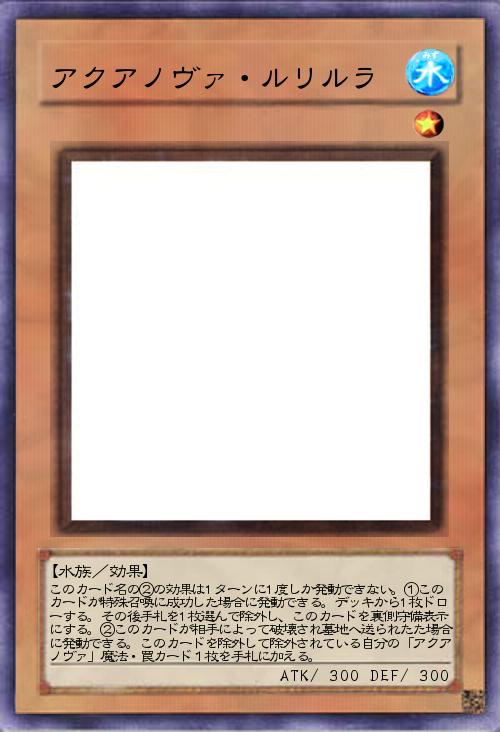 | このカード名の②の効果は1ターンに1度しか発動できない。①このカードが特殊召喚に成功した場合に発動できる。デッキから1枚ドローする。その後手札を1枚選んで除外し、このカードを裏側守備表示にする。②このカードが相手によって破壊され墓地へ送られたた場合に発動できる。このカードを除外して除外されている自分の「アクアノヴァ」魔法・罠カード1枚を手札に加える。 | |||