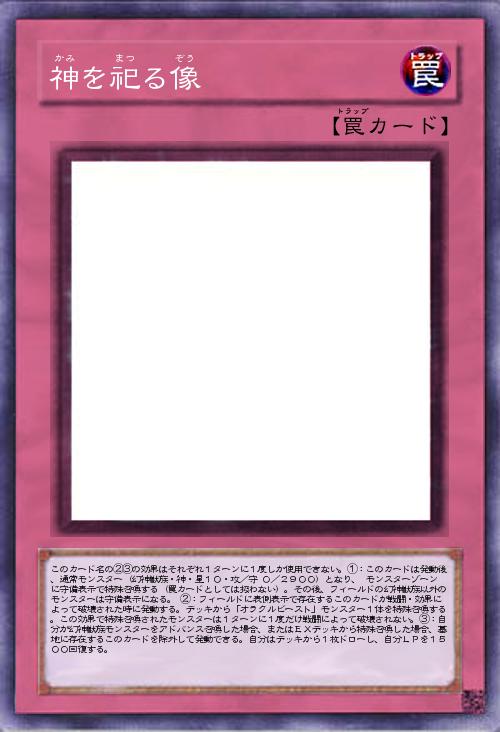 | このカード名の②③の効果はそれぞれ1ターンに1度しか使用できない。①:このカードは発動後、通常モンスター(幻神獣族・神・星10・攻/守 0/2900)となり、 モンスターゾーンに守備表示で特殊召喚する(罠カードとしては扱わない)。その後、フィールドの幻神獣族以外のモンスターは守備表示になる。 ②:フィールドに表側表示で存在するこのカードが戦闘・効果によって破壊された時に発動する。デッキから「オラクルビースト」モンスター1体を特殊召喚する。この効果で特殊召喚されたモンスターは1ターンに1度だけ戦闘によって破壊されない。③:自分が幻神獣族モンスターをアドバンス召喚した場合、またはEXデッキから特殊召喚した場合、墓地に存在するこのカードを除外して発動できる。自分はデッキから1枚ドローし、自分LPを1500回復する。 | |||