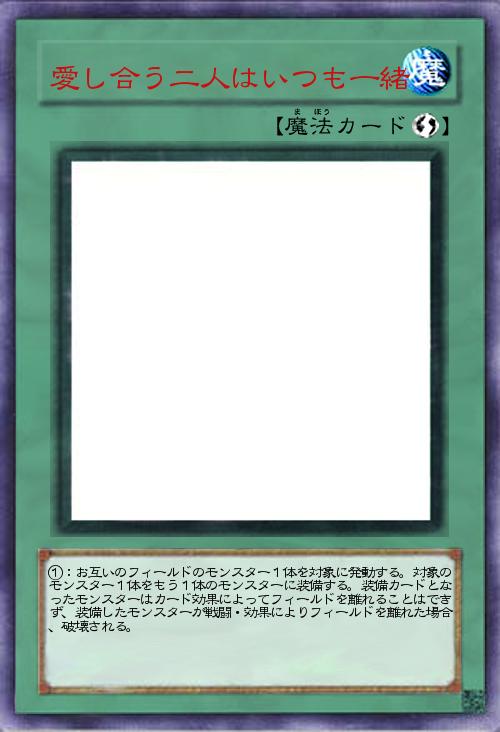 | ①:お互いのフィールドのモンスター1体を対象に発動する。対象のモンスター1体をもう1体のモンスターに装備する。装備カードとなったモンスターはカード効果によってフィールドを離れることはできず、装備したモンスターが戦闘・効果によりフィールドを離れた場合、破壊される。 | |||