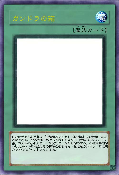 | 自分のデッキか手札の「破壊竜ガンドラ」1体を指定して発動することができる。召喚条件を無視しそのモンスターを特殊召喚する。その後、お互いの手札のカードを全てゲームから除外する。この効果で除外したカードの枚数分その特殊召喚された「破壊竜ガンドラ」の攻撃力が500ポイントアップする。 | |||
