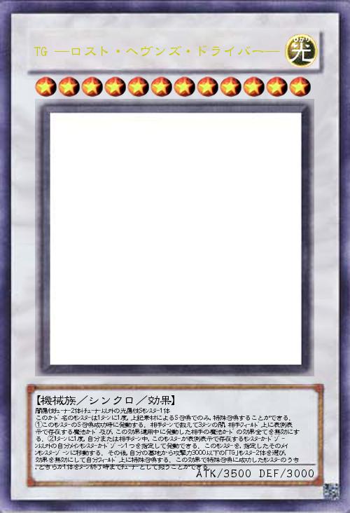 | 闇属性チュ-ナ-2体+チュ-ナ-以外の光属性Sモンスタ-1体 このカ-ド名のモンスタ-は1タ-ンに1度,上記素材によるS召喚でのみ,特殊召喚することができる.①このモンスタ-のS召喚成功時に発動する.相手タ-ンで数えて3タ-ンの間,相手フィ-ルド上に表側表示で存在する魔法カ-ド及び,この効果適用中に発動した相手の魔法カ-ドの効果全てを無効にする.②1タ-ンに1度,自分または相手タ-ン中,このモンスタ-が表側表示で存在するモンスタ-カ-ドゾ-ン以外の自分メインモンスタ-カ-ドゾ-ン1つを指定して発動できる.このモンスタ-を,指定したそのメインモンスタ-ゾ-ンに移動する.その後,自分の墓地から攻撃力3000以下の「TG」モンスタ-2体を選び,効果を無効にして自分フィ-ルド上に特殊召喚する.この効果で特殊召喚に成功したモンスタ-のうち,どちらか1体をタ-ン終了時までチュ-ナ- | |||