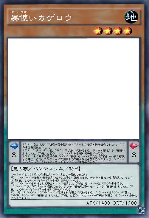 | (1):自分は元々の種族が昆虫族のモンスターしか召喚・特殊召喚できない。この効果は無効化されない。 (2):1ターンに1度、500LP支払い発動できる。デッキ・墓地から「蟲使い」もしくは「王蟲」と名のついたカード1枚を選んで手札に加える。 (3):もう片方の自分のPゾーンに「蟲使い」カードまたは「王蟲」カードが存在する場合、自分はEXデッキに表側表示で存在する昆虫族Pモンスターをリンクマーカーの向いていないメインモンスターゾーンにP召喚できる。 | |||