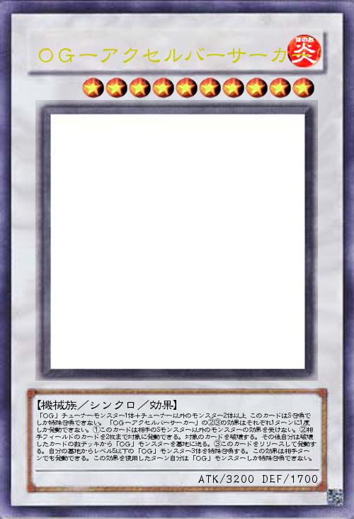 | 「OG」チューナーモンスター1体+チューナー以外のモンスター2体以上 このカードはS召喚でしか特殊召喚できない。「OGーアクセルバーサーカー」の②③の効果はそれぞれ1ターンに1度しか発動できない。①このカードは相手のSモンスター以外のモンスターの効果を受けない。②相手フィールドのカードを2枚まで対象に発動できる。対象のカードを破壊する。その後自分は破壊したカードの数デッキから「OG」モンスターを墓地に送る。③このカードをリリースして発動する。自分の墓地からレベル5以下の「OG」モンスター3体を特殊召喚する。この効果は相手ターンでも発動できる。この効果を使用したターン自分は「OG」モンスターしか特殊召喚できない。 | |||