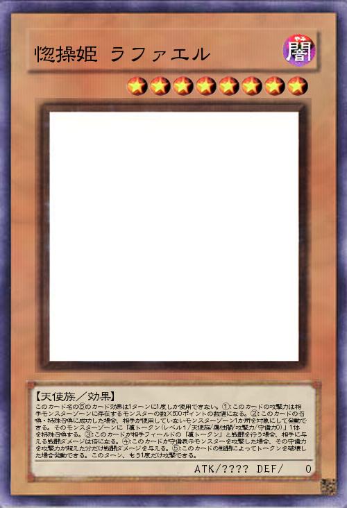 | このカード名の⑤のカード効果は1ターンに1度しか使用できない。①:このカードの攻撃力は相手モンスターゾーンに存在するモンスターの数×500ポイントの数値になる。②:このカードの召喚・特殊召喚に成功した場合、相手が使用していないモンスターゾーン1か所を対象にして発動できる。そのモンスターゾーンに「虜トークン(レベル1/天使族/属性闇/攻撃力/守備力0)」1体を特殊召喚する。③:このカードが相手フィールドの「虜トークン」と戦闘を行う場合、相手に与える戦闘ダメージは倍になる。④:このカードが守備表示モンスターを攻撃した場合、その守備力を攻撃力が超えた分だけ戦闘ダメージを与える。⑤:このカードの戦闘によってトークンを破壊した場合発動できる。このターン、もう1度だけ攻撃できる。 | |||