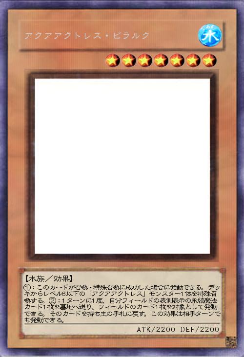 | ①:このカードが召喚・特殊召喚に成功した場合に発動できる。デッキからレベル6以下の「アクアアクトレス」モンスター1体を特殊召喚する。②:1ターンに1度、自分フィールドの表側表示の永続魔法カード1枚を墓地へ送り、フィールドのカード1枚を対象として発動できる。そのカードを持ち主の手札に戻す。この効果は相手ターンでも発動できる。 | |||