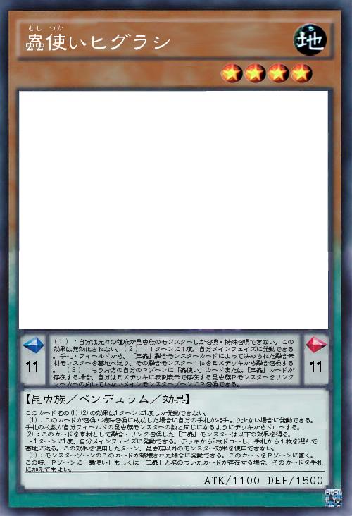 | (1):自分は元々の種族が昆虫族のモンスターしか召喚・特殊召喚できない。この効果は無効化されない。(2):1ターンに1度、自分メインフェイズに発動できる。手札・フィールドから、「王蟲」融合モンスターカードによって決められた融合素材モンスターを墓地へ送り、その融合モンスター1体をEXデッキから融合召喚する。 (3):もう片方の自分のPゾーンに「蟲使い」カードまたは「王蟲」カードが存在する場合、自分はEXデッキに表側表示で存在する昆虫族Pモンスターをリンクマーカーの向いていないメインモンスターゾーンにP召喚できる。 | |||