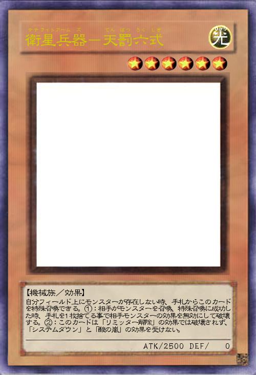 | 自分フィールド上にモンスターが存在しない時、手札からこのカードを特殊召喚できる。①:相手がモンスターを召喚、特殊召喚に成功した時、手札を1枚捨てる事で相手モンスターの効果を無効にして破壊する。②:このカードは「リミッター解除」の効果では破壊されず、「システムダウン」と「酸の嵐」の効果を受けない。 | |||