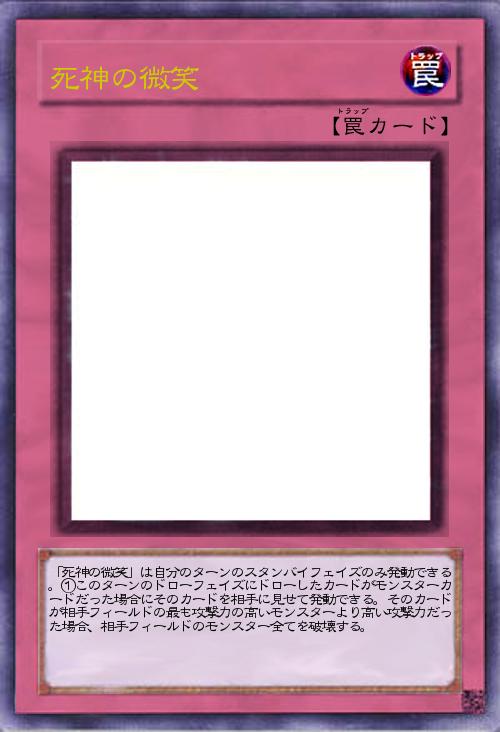 | 「死神の微笑」は自分のターンのスタンバイフェイズのみ発動できる。①このターンのドローフェイズにドローしたカードがモンスターカードだった場合にそのカードを相手に見せて発動できる。そのカードが相手フィールドの最も攻撃力の高いモンスターより高い攻撃力だった場合、相手フィールドのモンスター全てを破壊する。 | |||